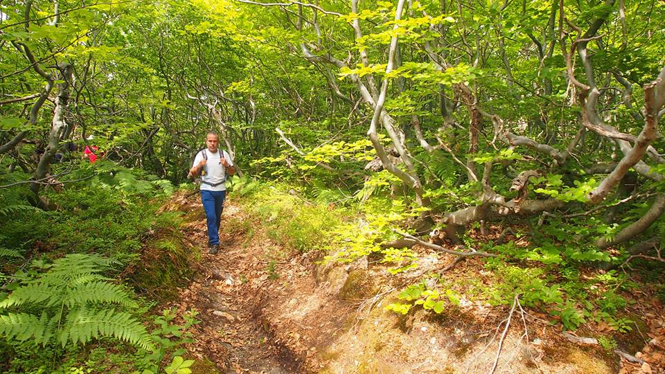 Περνούμε ένα ρεματάκι και μετά βαδίζουμε ομαλά πάνω σε μια ράχη με κατεύθυνση προς τα βορειοανατολικά. Απέναντι βλέπουμε την κορυφή Αγριόλευκες με τις πίστες του σκι. Η βλάστηση εδώ αποτελείται κυρίως από χαμηλές οξιές και σε ένα σημείο περνούμε από τα ερείπια πέτρινου κτίσματος.