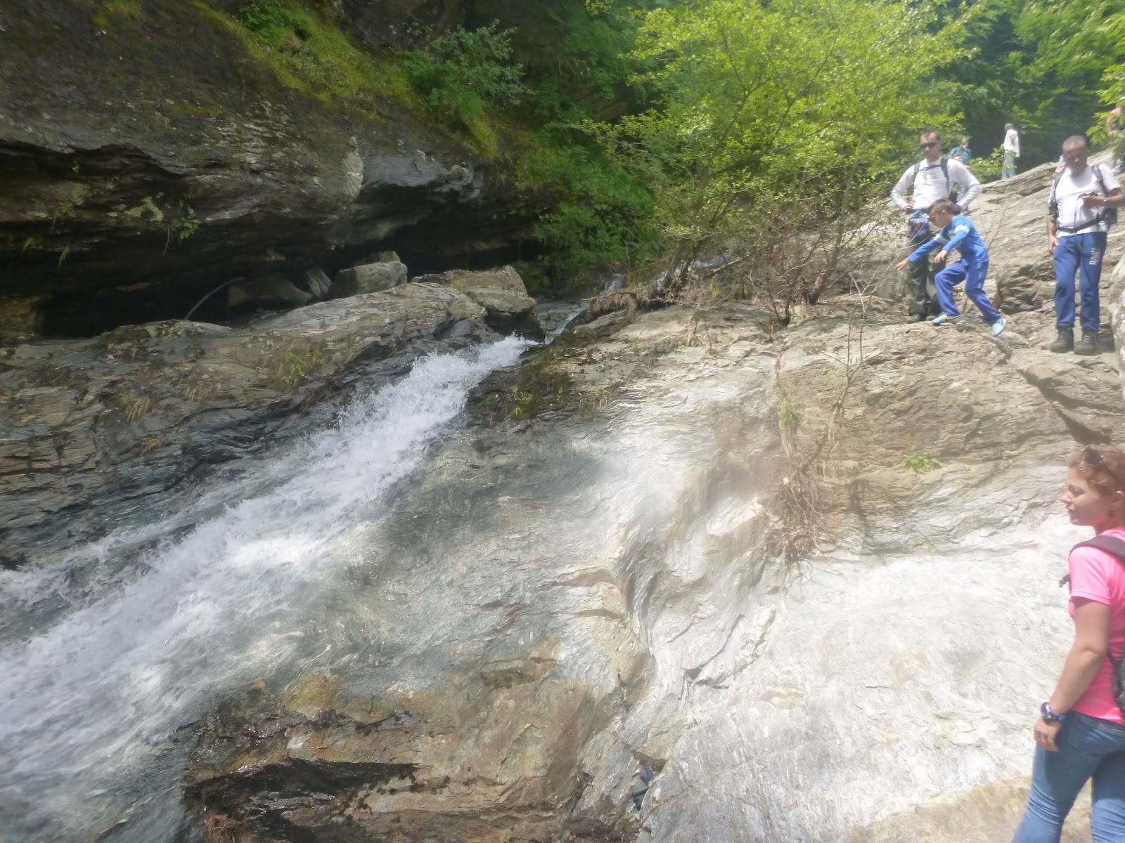 Εδώ θα κάνουμε οπωσδήποτε μια παράκαμψη πέντε λεπτών προς τα αριστερά για να επισκεφθούμε τον καταρράκτη. Ο δρόμος ξαναπερνά το ρέμα και σε λίγο τερματίζει εκεί όπου συναντά νέο ρέμα. Τα νερά εδώ κάνουν μια μικρή βάθρα και μετά κατηφορίζουν ορμητικά σε αυλάκι μέσα στο βράχο.
